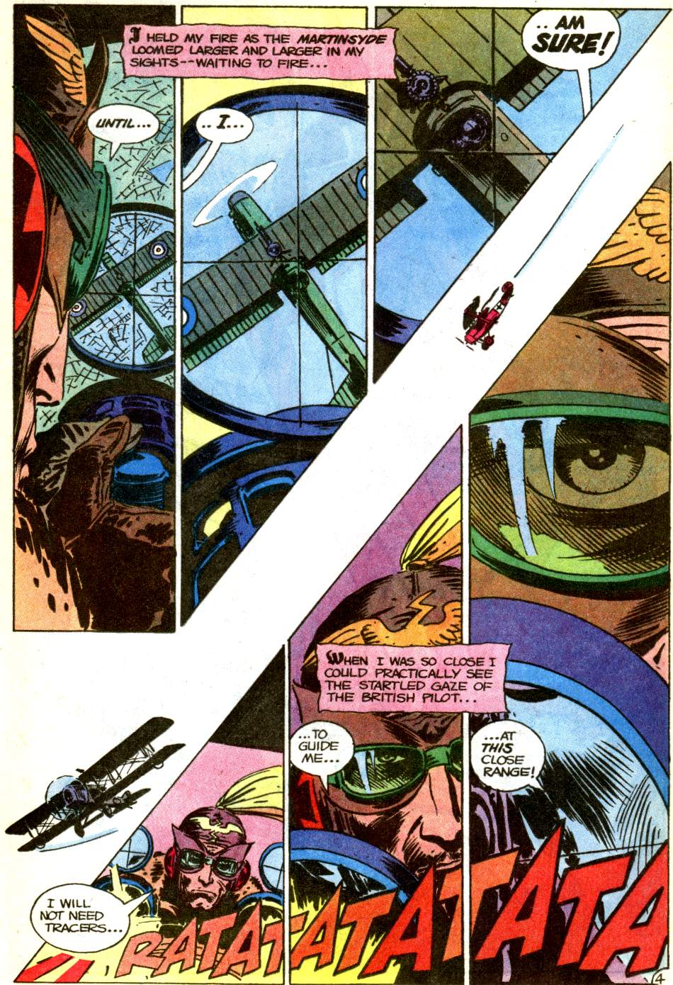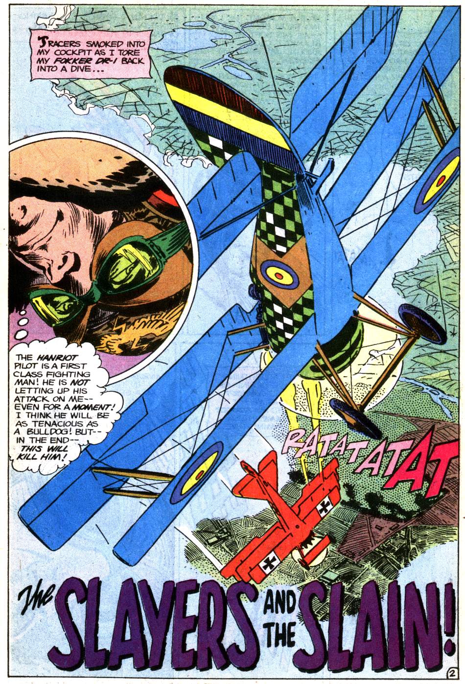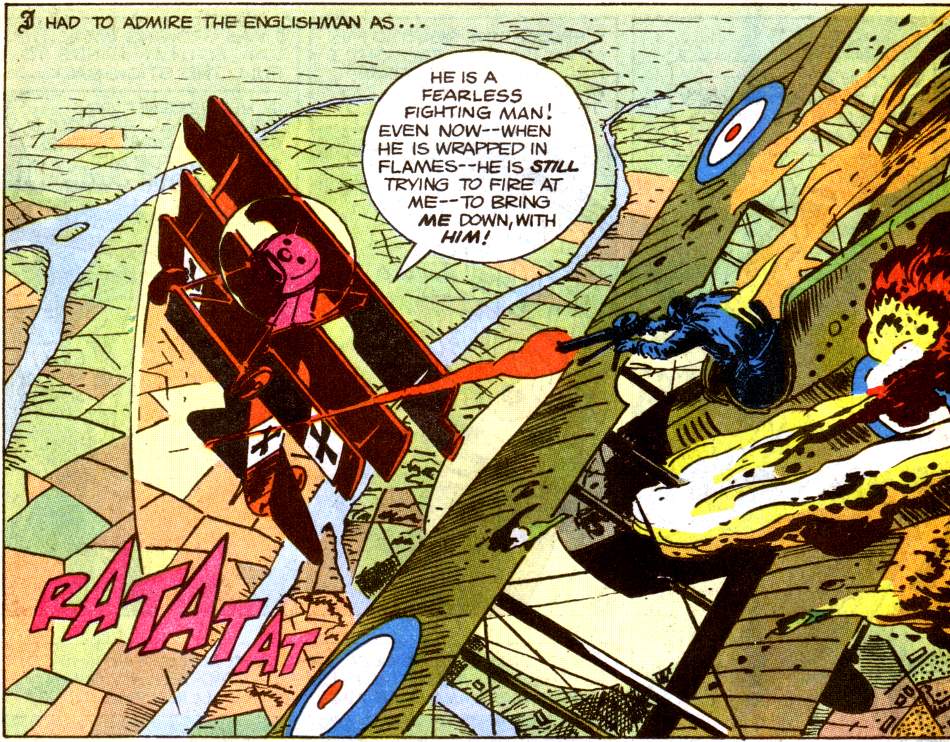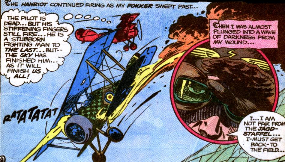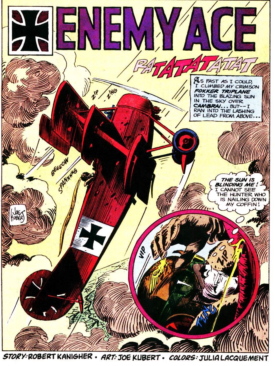 Ποιός να ενδιαφερθεί σήμερα για μια σειρά κόμικς με ιστορίες αερομαχιών απο τον Πρώτο Παγκόσμιο Πόλεμο; Εδώ παραθέτουμε δείγματα απο τον "Enemy Ace", μια τέτοια σειρά με ήρωα τον φημισμένο Κόκκινο Βαρώνο (Red Baron) άσσο πιλότο της Γερμανίας που έγινε θρύλος κατα τον Πρώτο Παγκόσμιο Πόλεμο. Με το αεροπλάνο του ένα κόκκινο Φόκκερ με τριπλά φτερά ήταν βέβαιος θάνατος σε όποιον τον αντιμετώπιζε. Η ζωγραφική του Joe Kubert είναι ανυπέρβλητη σε αυτή τη σειρά.Το ρητό του Kόκκινου Βαρώνου Rittmeister Von Hammer ήταν: "Ο Θάνατος δεν πάει διακοπές". Απο τα DC comics.