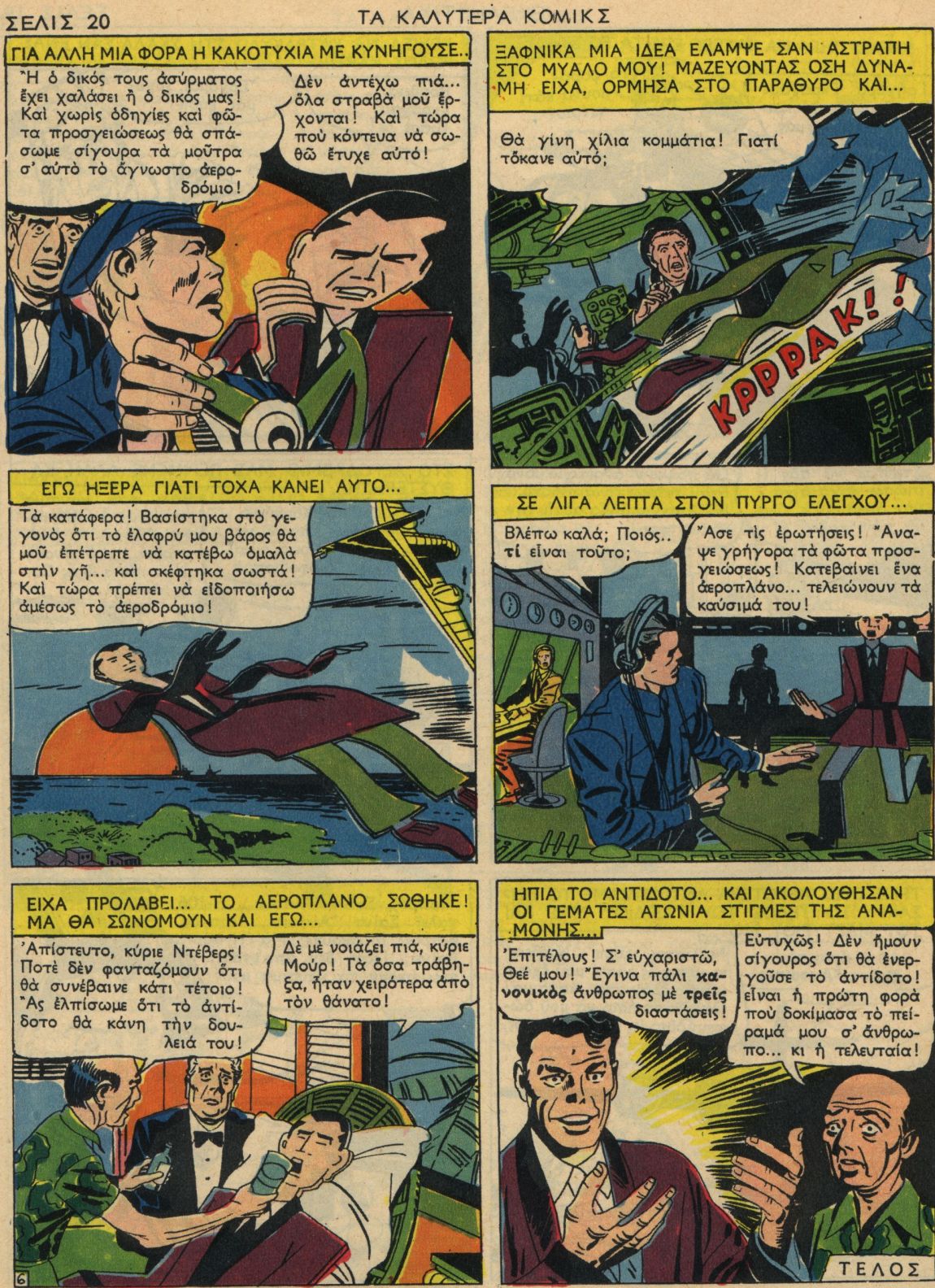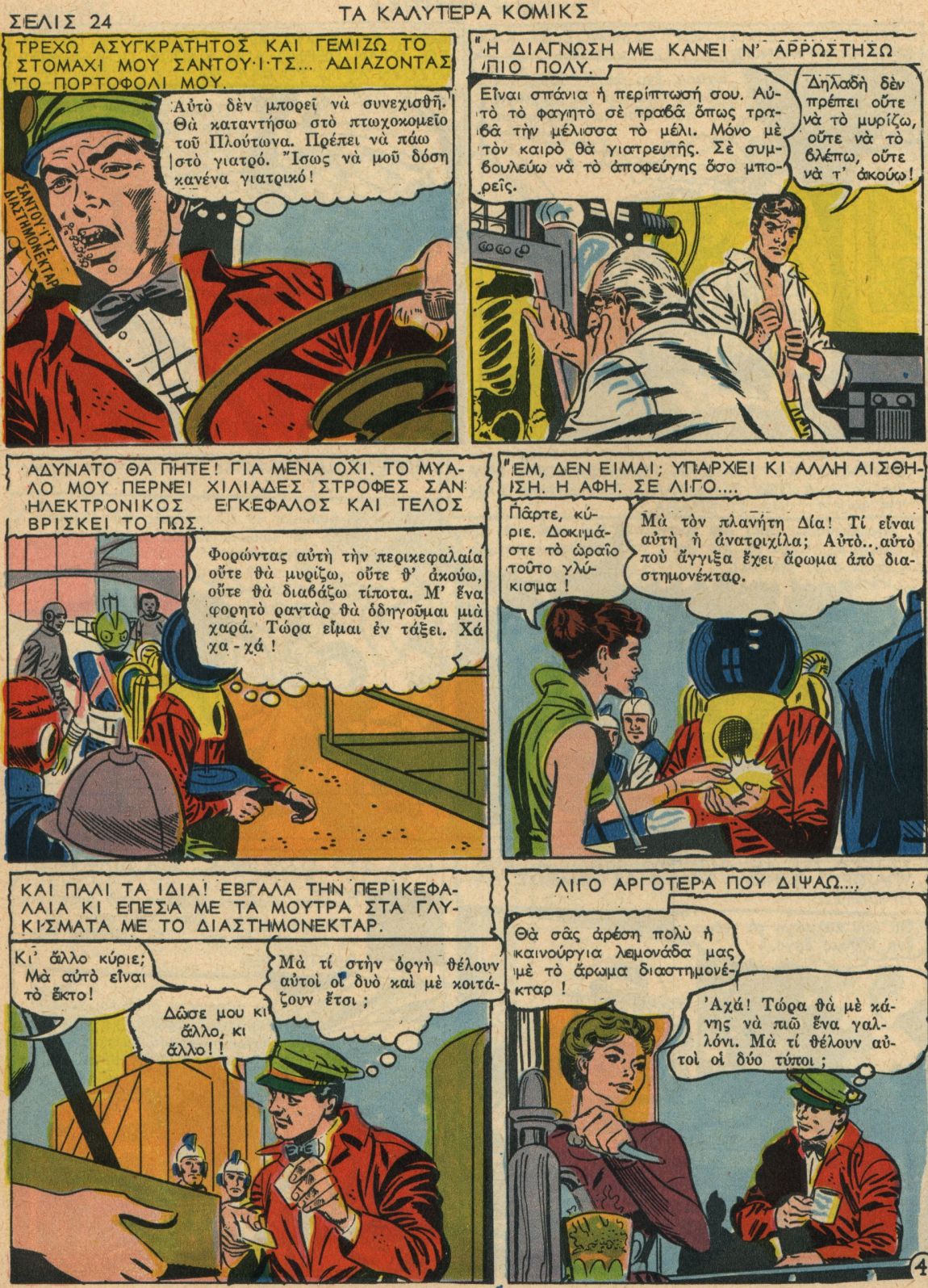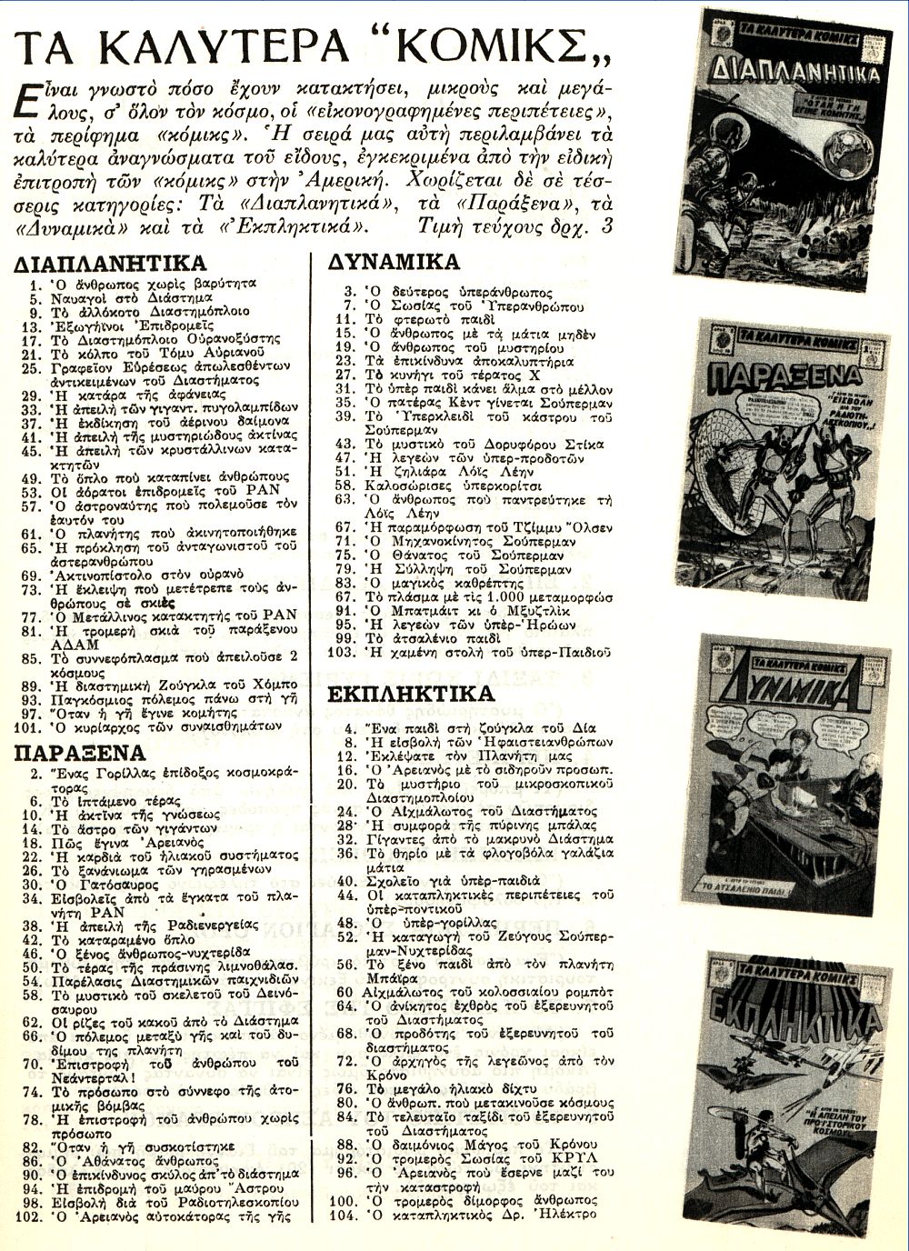 Σε μιά εποχή όπου ο άνθρωπος δεν είχε πάει ακόμα στο φεγγάρι, η τηλεόραση ήταν σχεδόν ανύπαρκτη, το video, οι computers και τα DVD ήταν απλά εκτός ορίων λογικής και ο κινηματογράφος πρωτόγονα ασπρόμαυρος, αυτή η απόλυτα προσεγμένη έκδοση ακόμα και για τα σημερινά δεδομένα ήταν μια πραγματική επανάσταση στη διασκέδαση των παιδιών. Το κυρίως περιεχόμενο τους ήταν τίτλοι της τότε εποχής "silver age" των DC comics ( που ονομαζόταν τότε "National Comics Publications Inc ") με θέματα ιστορίες επιστημονικής φαντασίας που οι συχνά φιλοξενούμενοι υπερ-ήρωες ήταν οι : " Υπεράνθρωπος " στα πρώτα τεύχη και μεταονομασμένος στο πιο εύηχο και θρυλικό " Σούπερμαν " ( Superman ), το " Υπερ Παιδί " ( Superboy ), o " Nυκτερίδας " ( Batman ) μαζί με τον Ρόμπιν το παιδί θαύμα, o " Παράξενος Αδάμ " ( Adam Strange ), ο καλύτερος φίλος του Σούπερμαν Τζίμυ Όλσεν, το κορίτσι του Σούπερμαν Λοις Λέιν, ο Τόμυ ο Αυριανός ( Τommy Tomorrow ), το " Πράσινο Βέλος " ( Green Arrow ), ο " Εξερευνητής του Διαστήματος " ( Space Ranger ), το " Υπερ-κορίτσι " ( Supergirl ), ο Υδατάνθρωπος ( Aquaman ) με το Υδατόπαιδο ( Αqualad ), το Γεράκι και η συντροφός του Γερακίνα ( Hawkman, Hawkgirl ). Απο μία φορά εμφανίστηκαν η "Εκπληκτική Περίπολος" ( Doom Patrol ), η Λεγεώνα των Υπερηρώων του 30ού αιώνα ( Legion of Super Heroes ) και το " Συνδικάτο της Νεμέσεως " ( Justice League of America ). " Τα Καλύτερα Κόμικς " συνεχίστηκαν για τρία χρόνια σε σύνολο 136 εβδομαδιαίων τευχών και ξαφνικά σταμάτησαν τo 1963. Η φτωχή αγορά της τότε Ελλάδας ισως φαίνεται δεν μπόρεσε να στηρίξει τη ακριβή για τα τότε δεδομένα αυτή έκδοση που παραμένει ακόμα και σήμερα θρυλική και άκρως συλλεκτική. |