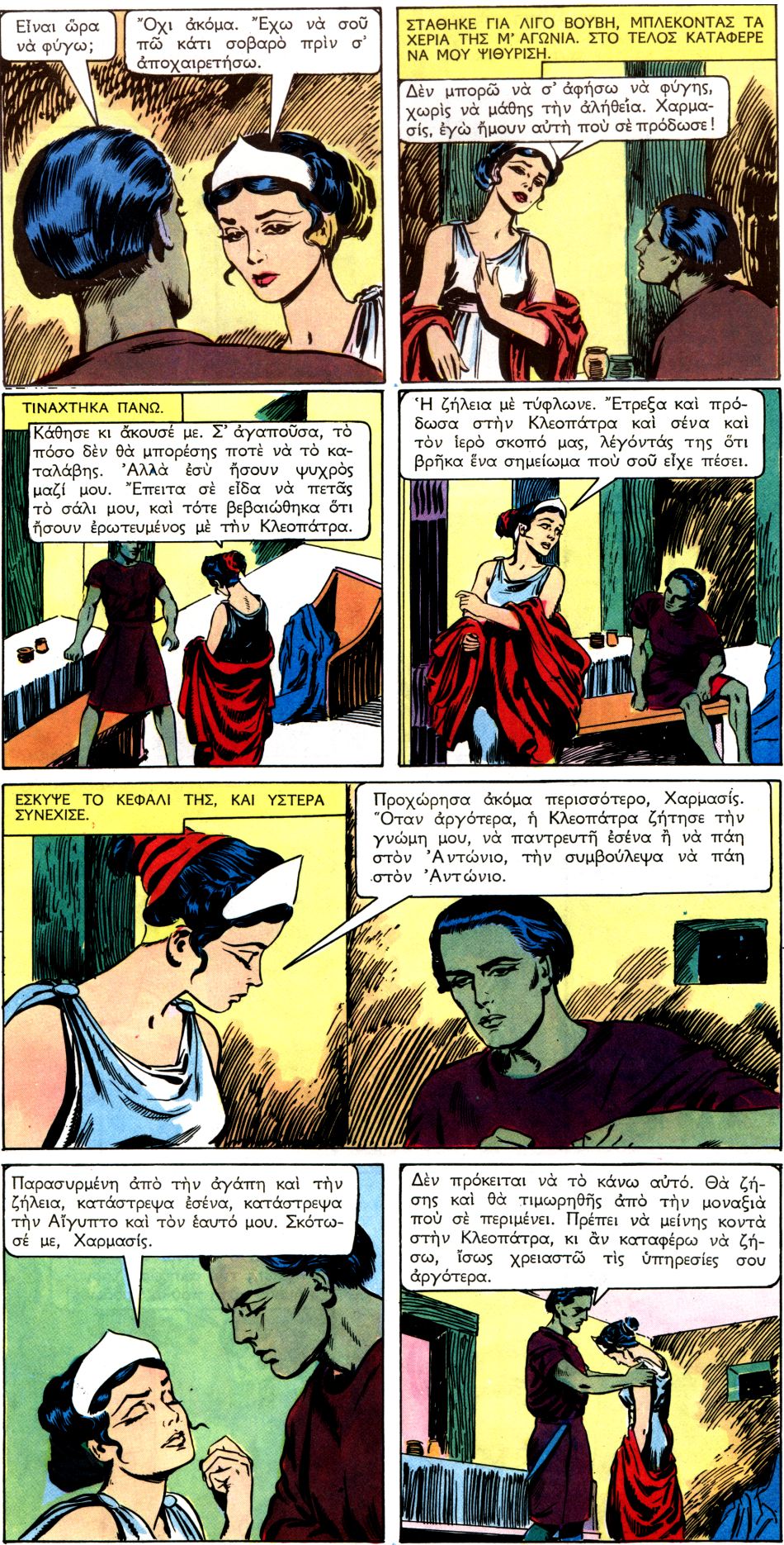 Ο αιγύπτιος Χαρμασίς ήταν επιφορτισμένος με το ιερό καθήκον να θανατώσει τη Ελληνίδα Βασσίλισσα Κλεοπάτρα και να ελευθερώσει έτσι την Αίγυπτο. Η Κλεοπάτρα όμως απέτρεψε τα σχεδιά του. Η σαγγηνευτική ομορφιά της, η μεθυστική γοητεία της, η απρόβλεπτη εξυπνάδα της, η αξεπέραστη φιλοδοξία της έκαναν τούς άνδρες υποχείρια της... |